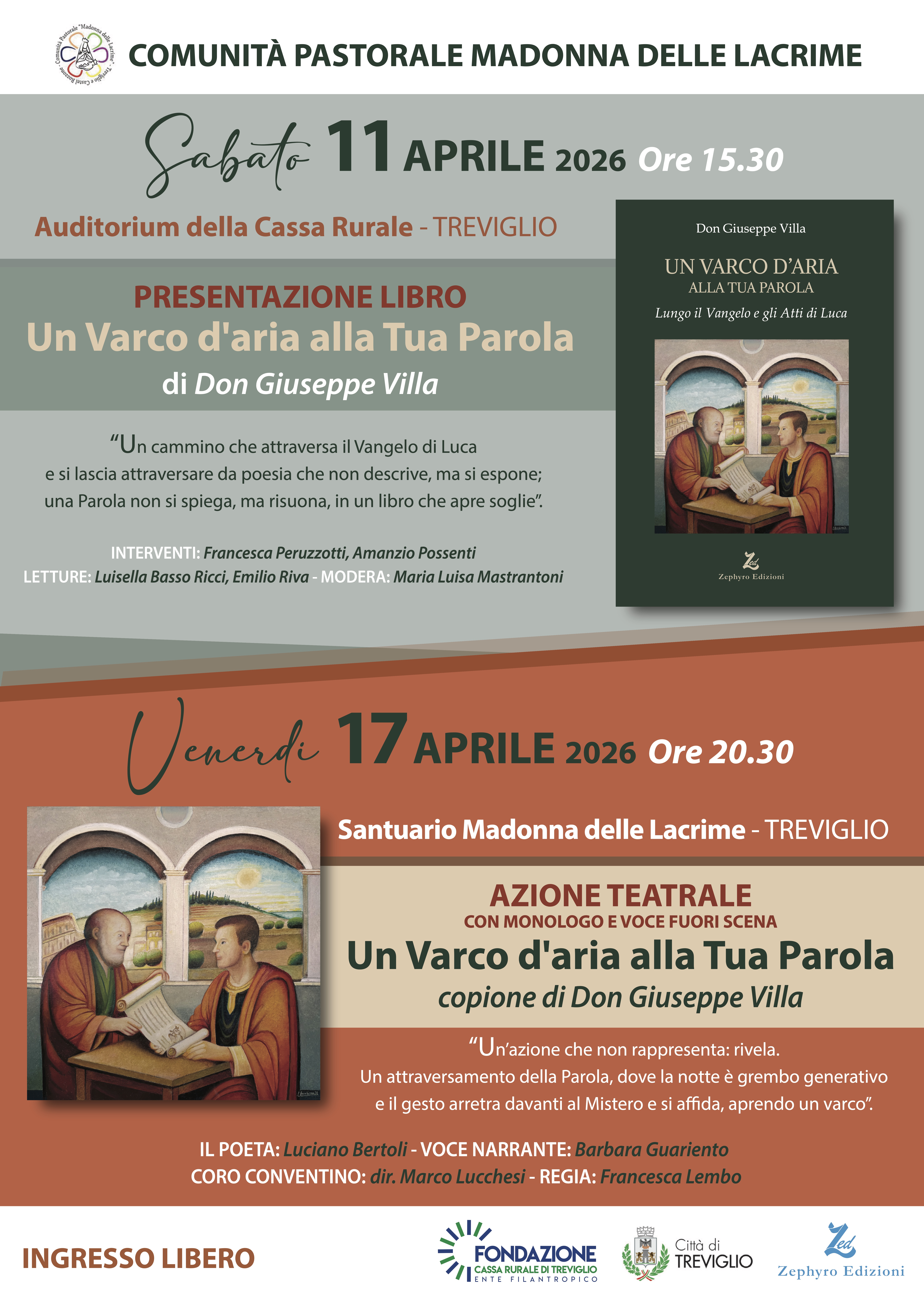 Un doppio appuntamento tra parola, poesia e teatro per esplorare in profondità il rapporto tra Vangelo e linguaggio contemporaneo. La Comunità Pastorale Madonna delle Lacrime propone due momenti complementari dedicati al libro “Un varco d’aria alla Tua Parola” di Don Giuseppe Villa, un’opera che attraversa il Vangelo di Luca lasciandosi contaminare dalla forza evocativa della poesia.